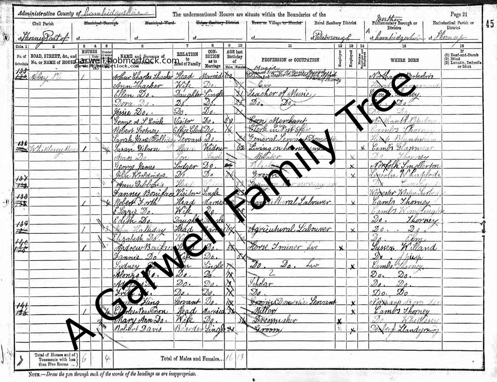| Census | 5 April 1891 (Age 19) Thorney, Cambridgeshire, England Address: Abbey Place