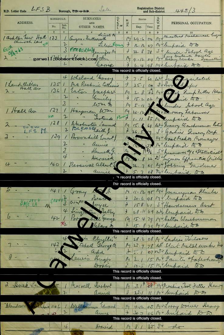 | Census | 29 September 1939 (Age 54) Sale, Cheshire, England Address: 1 Hall Avenue