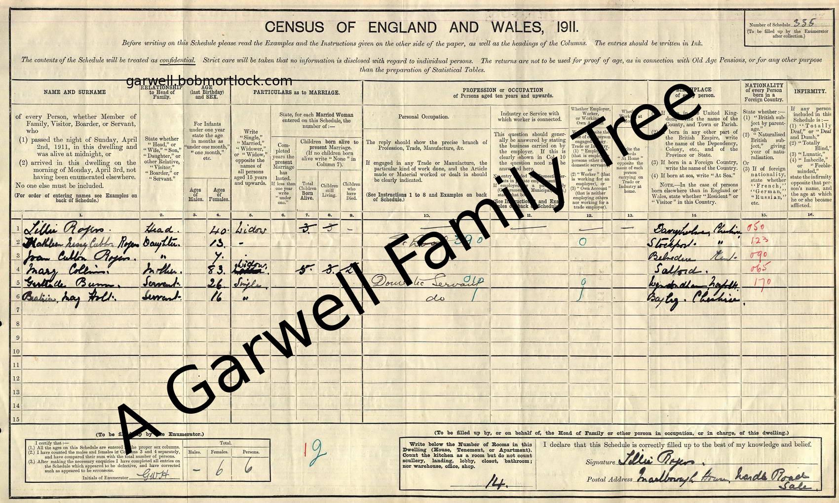 | Census | 2 April 1911 (Age 26) Sale, Cheshire, England Address: Marlborough House, Wardle Road