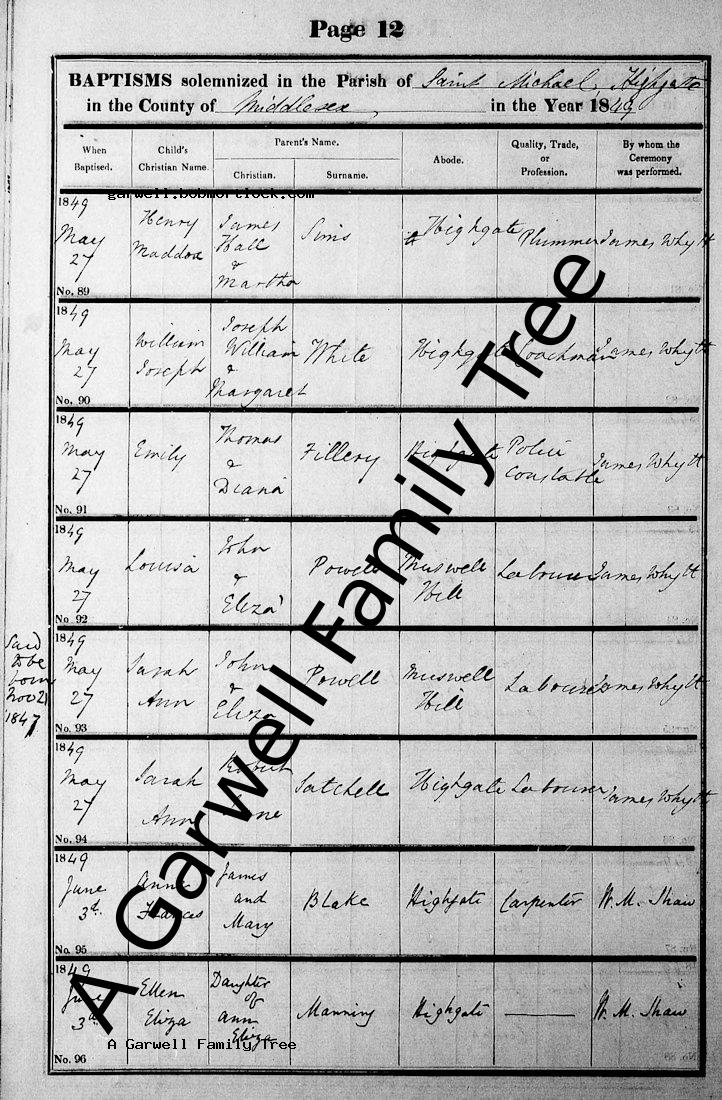 | Baptism | 27 May 1849 Camden, N London, England Address: St Michael's, Highgate |