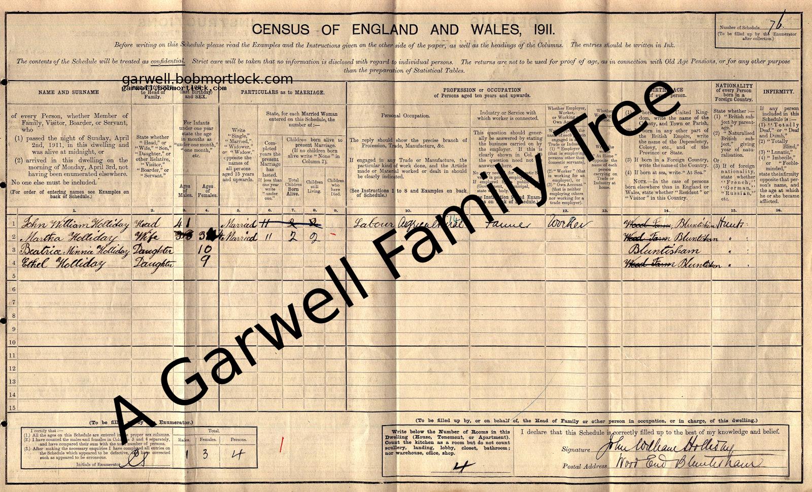 | Census | 2 April 1911 (Age 34) Bluntisham, Cambridgeshire, England Address: North End